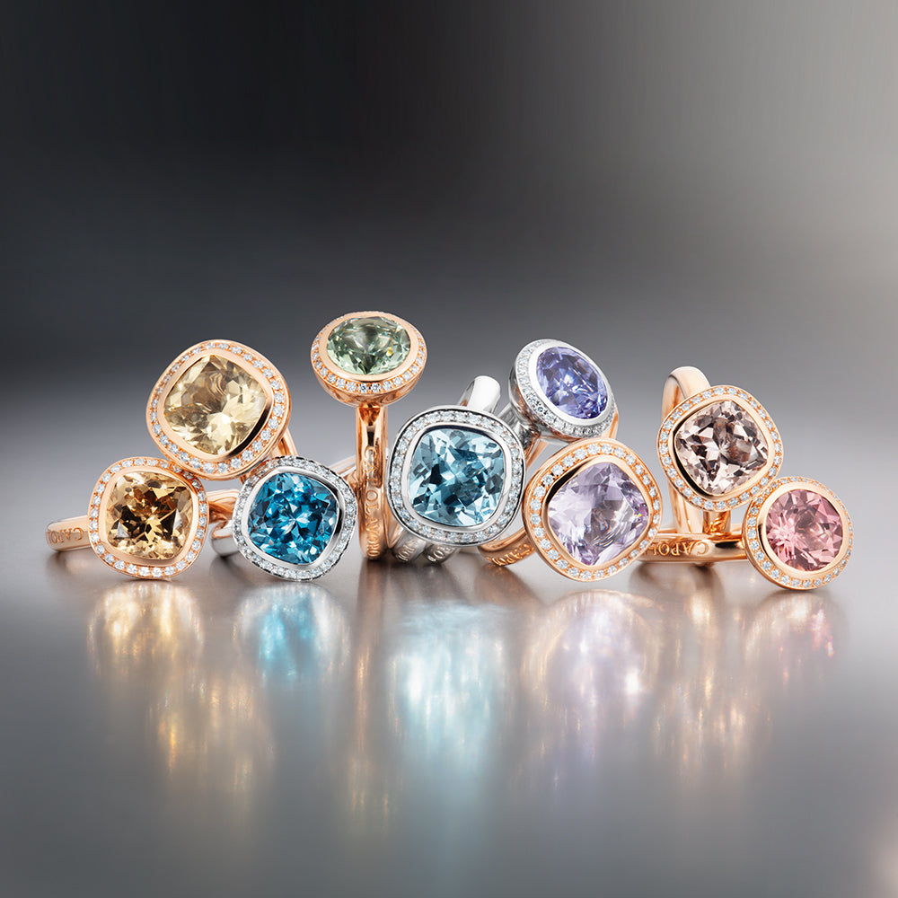 They spin like colorful balloons floating up into the sky. The ring heads of the Twinkle Balloon line not only attract attention with their sparkling colored stones, framed by a fine diamond wreath. They are also flexible and entice the fingers to play. Irresistible! These enchanting pieces of jewelry are available in different sizes and shapes.